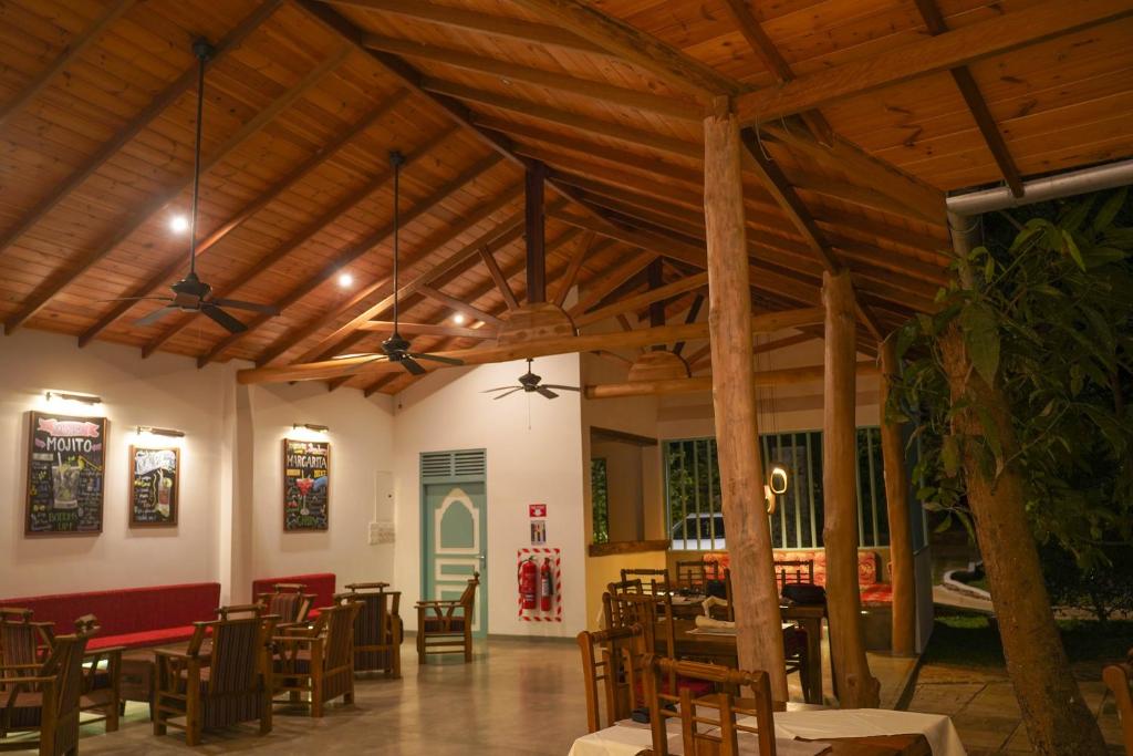 Elegant Accommodations: Kandalama Lodge in Dambulla offers a swimming pool with stunning views, a lush garden, and a terrace. Guests enjoy free WiFi, an indoor pool, and a restaurant serving lunch and dinner in a family-friendly, traditional, modern, and romantic ambiance.