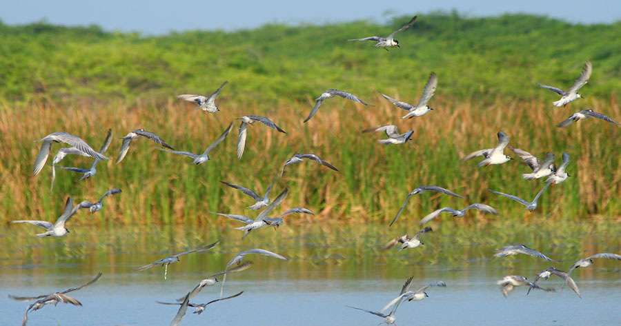 Each and every species of waterbird found in Sri Lanka is believed to visit Bundala National Park. Nearly 200 species of birds have been recorded within the park, out of which 58 species are migratory birds. During September and March, hordes of migrants arrive in Bundala; among them are Marsh and Curlew Sandpipers, Curlew and Greenshanks, Golden and Kentish Plovers, and Large and Lesser Sandplovers. While the broad-billed sandpiper and red-necked phalarope are the rare visitors, the most famous migratory bird is the greater flamingo. Hoards of flamingoes are one of the most common sights. In this period over 10,000 shorebirds might be feeding on any one day. The lagoons at the park attract a great variety of aquatic birds: among them are ibis, pelicans, painted storks, black-necked storks, terns, gulls, sandpipers, snipes, teals, egrets, and spoonbills. Endemic birds include the brown-capped babbler, Ceylon woodshrike, and Ceylon junglefowl.